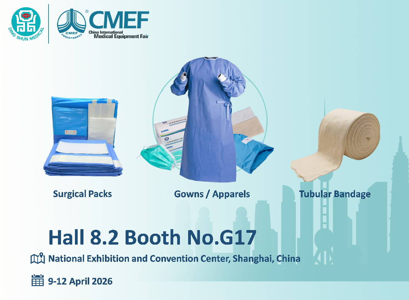Perusahaan akan memamerkannya Paket Bedah , Gaun/Pakaian , dan Perban berbentuk tabung lini produk di Hall 8.2, Booth No. G17. Acara ini berlangsung di Pusat Pameran dan Konvensi Nasional di Shanghai.